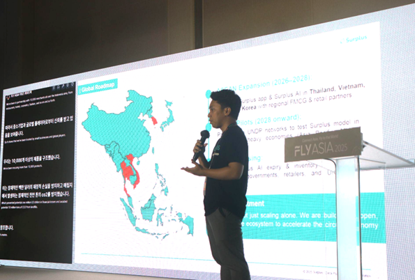 Agung Saputra menyampaikan ide Surplus Indonesia pada kompetisi pitching FLY 40 di ajang FLY ASIA 2025 (Dok. Tim Surplus Indonesia)