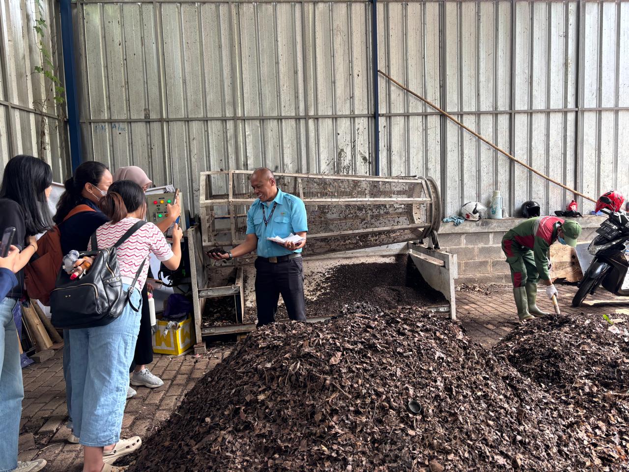 Selama kunjungan, mahasiswa mengamati proses pengelolaan sampah yang diklasifikasikan menjadi empat kategori: sampah organik, sisa makanan, sampah anorganik, dan residu. Sampah organik berupa daun dan ranting diolah melalui proses pengomposan yang meliputi penjemuran, pencacahan, dan dekomposisi alami hingga menjadi pupuk kompos. Sementara itu, sisa makanan dikelola secara terpisah menggunakan larva Black Soldier Fly (maggot) yang mempercepat proses penguraian sekaligus menghasilkan biomassa bernilai guna sebagai pakan ternak. Pada kategori sampah anorganik, mahasiswa melihat langsung proses pemilahan manual, seperti pelepasan label, pembersihan, serta pemisahan material yang dapat didaur ulang untuk kemudian dijual ke pengepul. Sisa sampah yang tidak memiliki nilai guna dikategorikan sebagai residu dan selanjutnya dikirim ke tempat pembuangan akhir.
