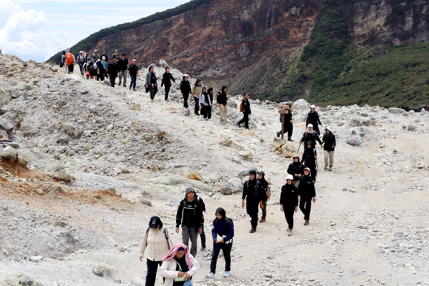Mahasiswa menyusuri jalur di area kawah Gunung Papandayan.