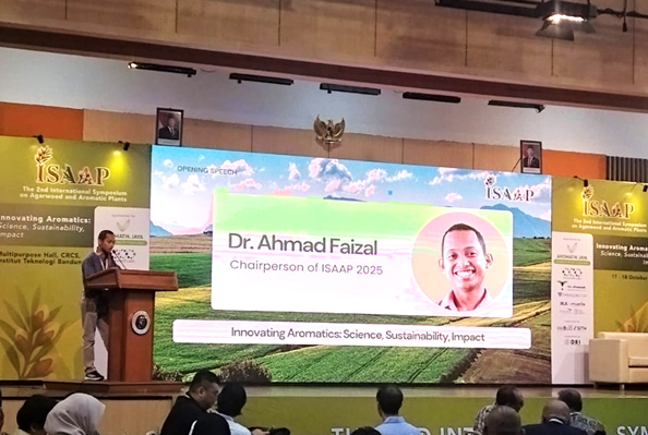 Simposium dibuka secara resmi pada Jumat (17/10/2025) dengan rangkaian pidato dari para pimpinan. Dr. Ahmad Faizal, selaku Chairperson ISAAP 2025 , membuka acara dengan menggarisbawahi tema simposium. Beliau menyoroti potensi besar gaharu (agarwood) sebagai salah satu komoditas aromatik paling berharga, dengan proyeksi pasar global mencapai $16 miliar USD pada tahun 2029. Dr. Faizal juga memperkenalkan Pusat Riset dan Kolaborasi Gaharu sebagai kemitraan antara ITB, BRIN, dan IPB University untuk memajukan riset gaharu berbasis sains.